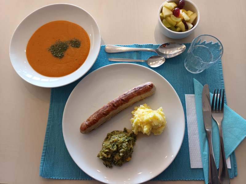 Es gab eine leckere Rote Linsen Paprika-Suppe, Wirsinggemüse mit Bratwurst und Kartoffelpüree und zum Abschluss einen bunten Obstsalat mit Vanillesahne.